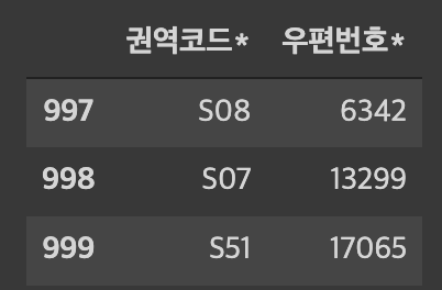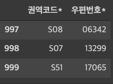 - 권역코드-우편번호 매핑 데이터의 컬럼명을 바꾸고('우편번호*'->'BAS_ID')