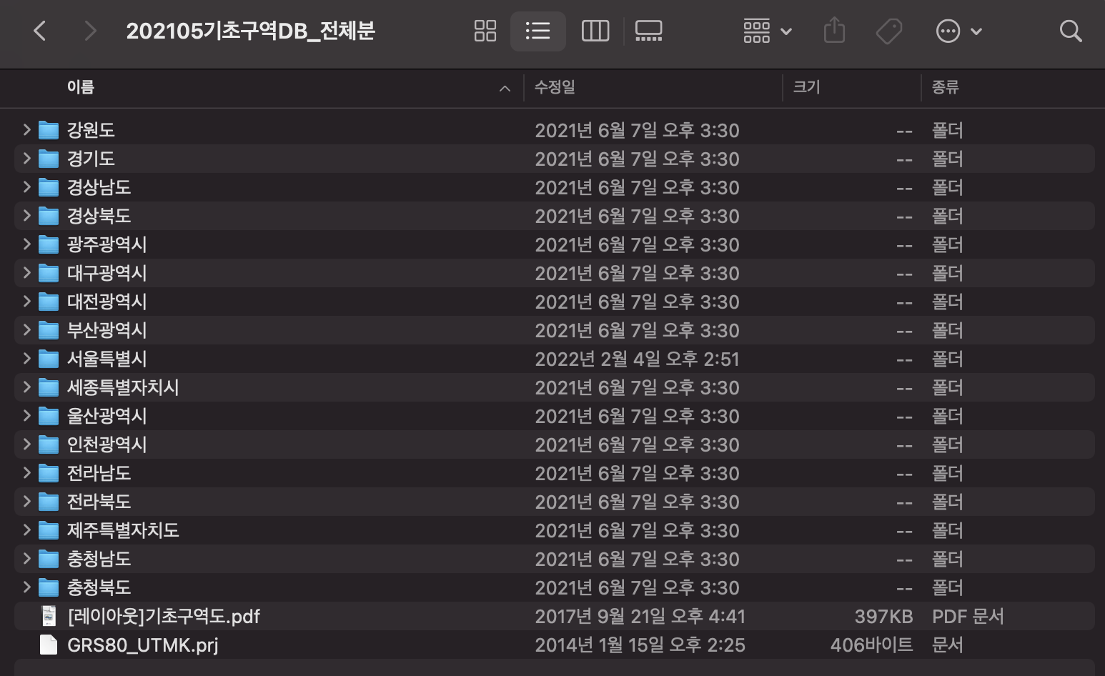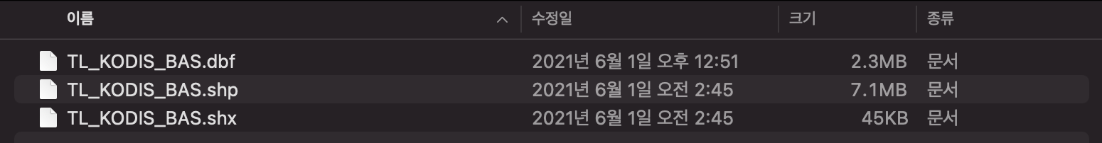 - .shp 파일은 나머지 .dbf, .shx 파일이 없으면 불러올 수 없다. 그리고 “GRS80_UTMK.prj”는 데이터가 사용하는 좌표계 정보가 들어있다. 결과적으로 총 4가지 파일이 모두 한 곳에 있도록 한다.