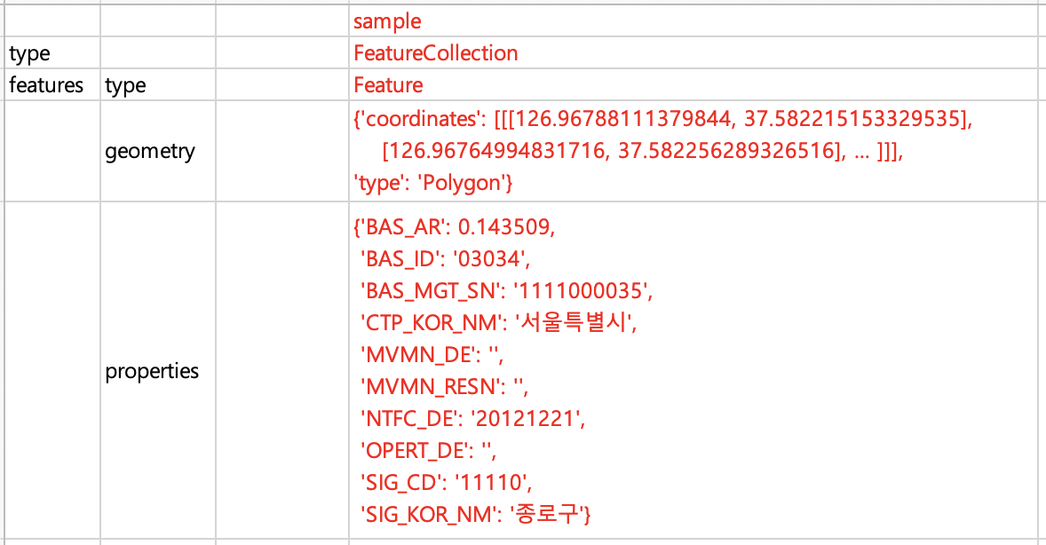 geo_json['features'][0]['geometry'] # {'coordinates': [[[126.96788111379844, 37.582215153329535], ...