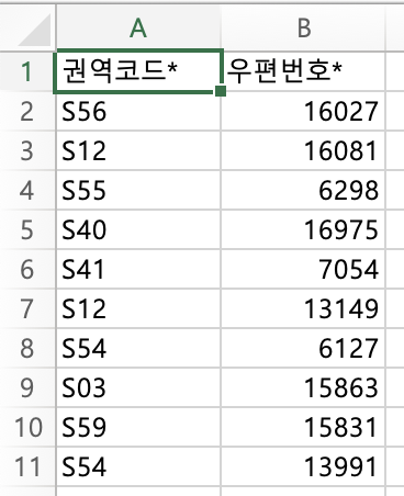 권역코드-우편번호 매핑 정보를 가져온 뒤 컬럼명을 변경합니다. ('우편번호*'->'BAS_ID', '권역코드*'->'AREA_CD')