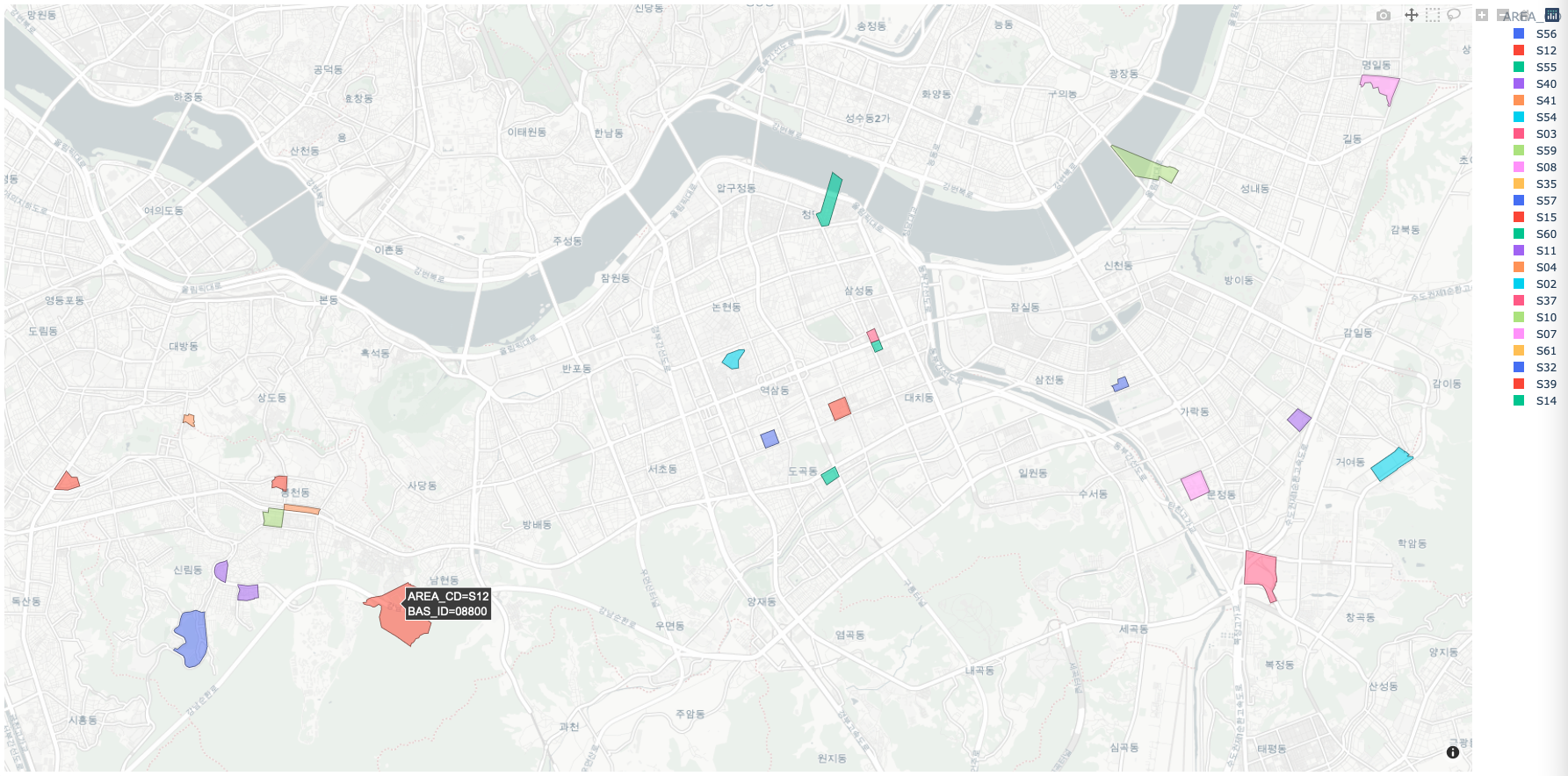 해당 지역에 마우스를 올릴 경우 AREA_CD, BAS_ID 정보를 얻을 수 있습니다.