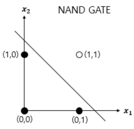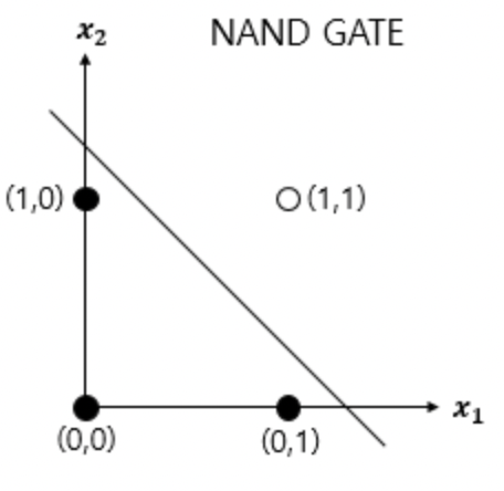 NAND 조건을 이용해 두 개의 입력값이 1인 경우에는 출력 값이 0, 나머지 경우에는 모두 출력 값이 1이 나오게 함.