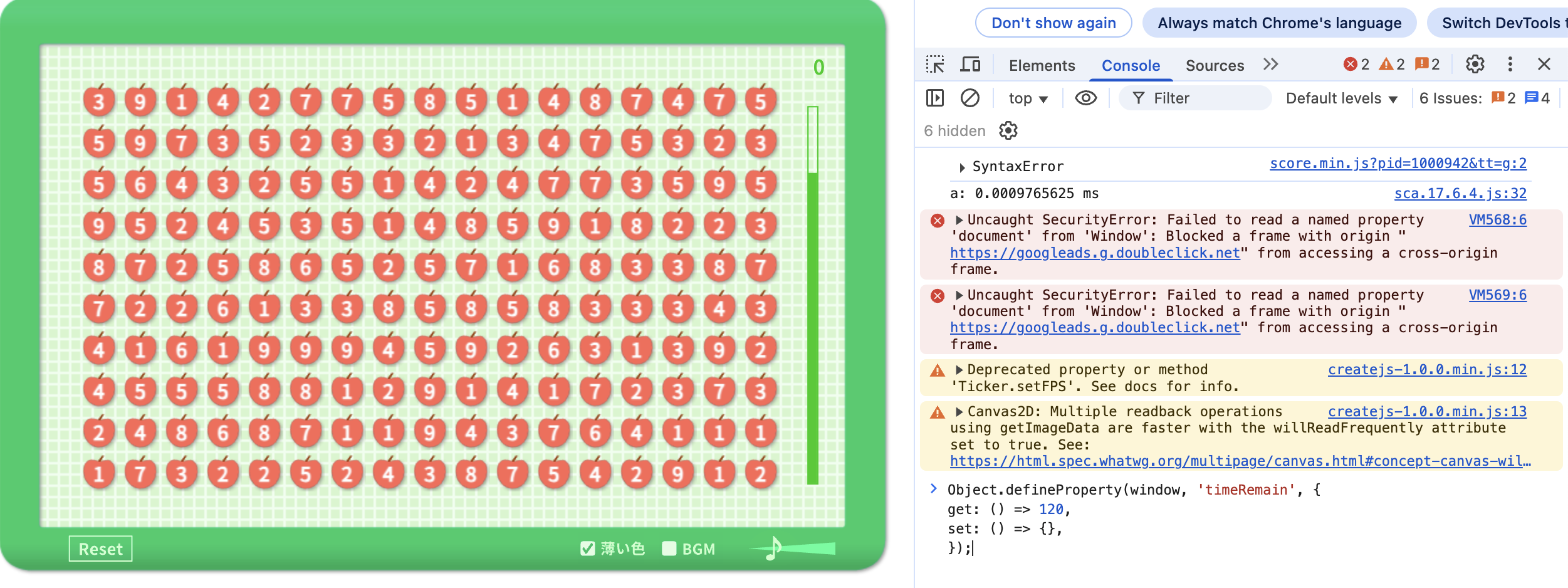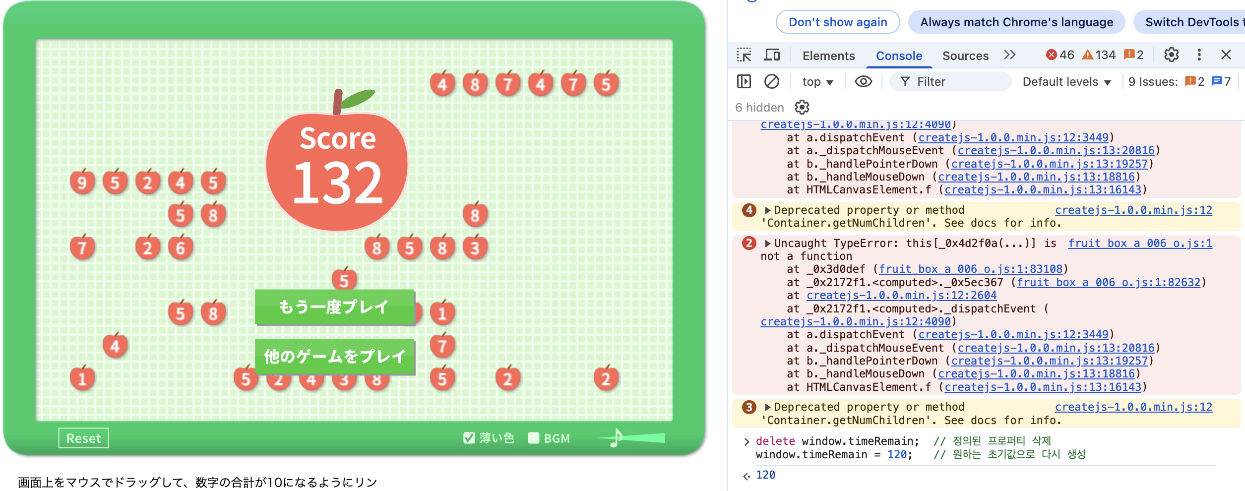 Object.defineProperty(window, 'timeRemain', {get: () => 120,set: () => {},});'를 입력하면 제한 시간 없앨 수 있음.
