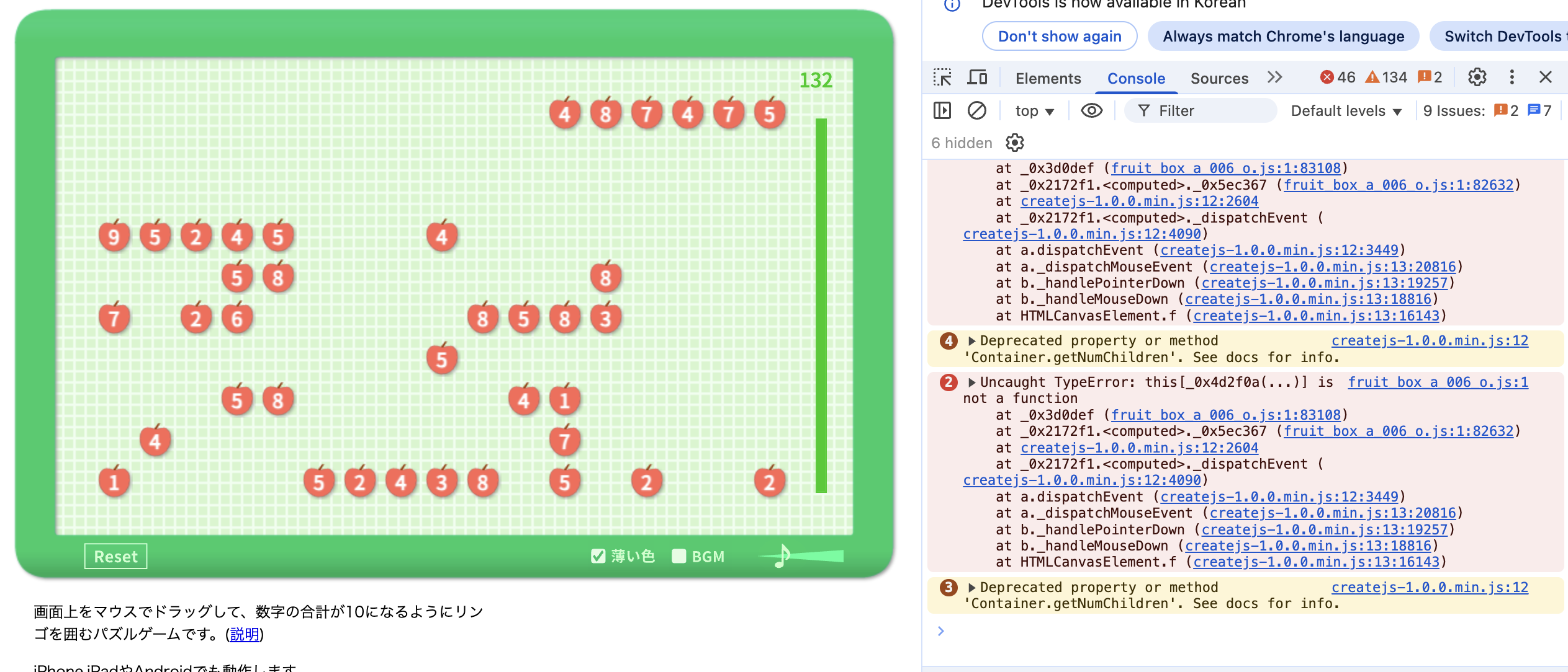 画面上をマウスでドラッグして、数字の合計が10になるようにリンゴを囲むパズルゲームです。(説明) iPhone,iPadやAndroidでも動作します。